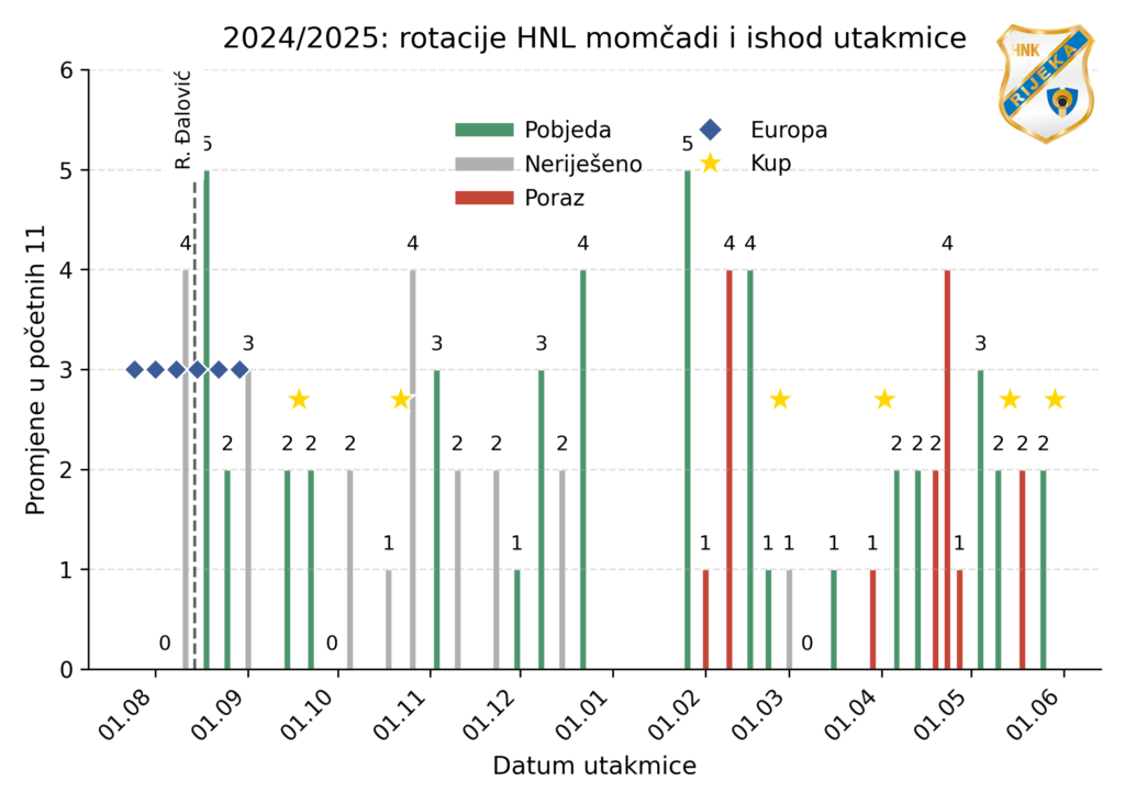 Na prvom grafu prikazana je posljednja šampionska sezona, 24/25. Rijeka je tada ispala iz Europe prije početka jeseni i mogla se u potpunosti koncentrirati na HNL. Radomir Đalović promoviran je u glavnog trenera između dvije europske utakmice protiv Elfsborga, a sezonu je obilježio vrlo mali broj rotacija, što je na kraju rezultiralo osvajanjem titule.