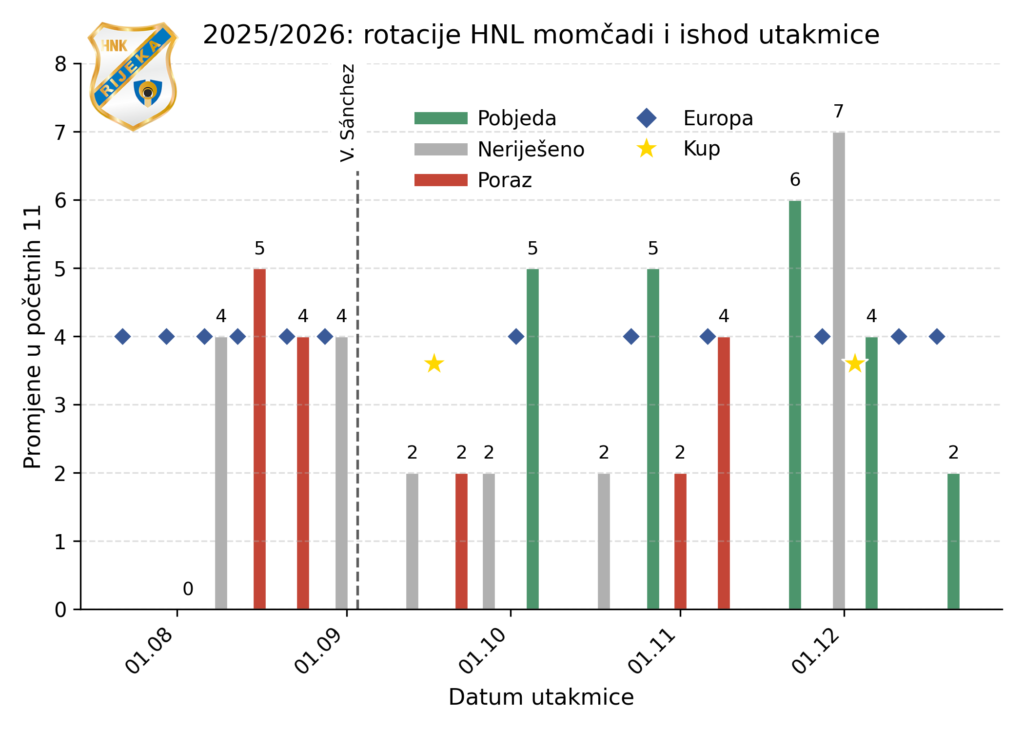 Rijeka je ovu polusezonu odradila u paklenom ritmu: 31 službena utakmica, ne računajući Istru. To je vrlo blizu opterećenja čitavog prvenstva. U takvom tempu rotacije više nisu stvar izbora, nego nužnost ako želite sačuvati igrače od težih ozljeda.