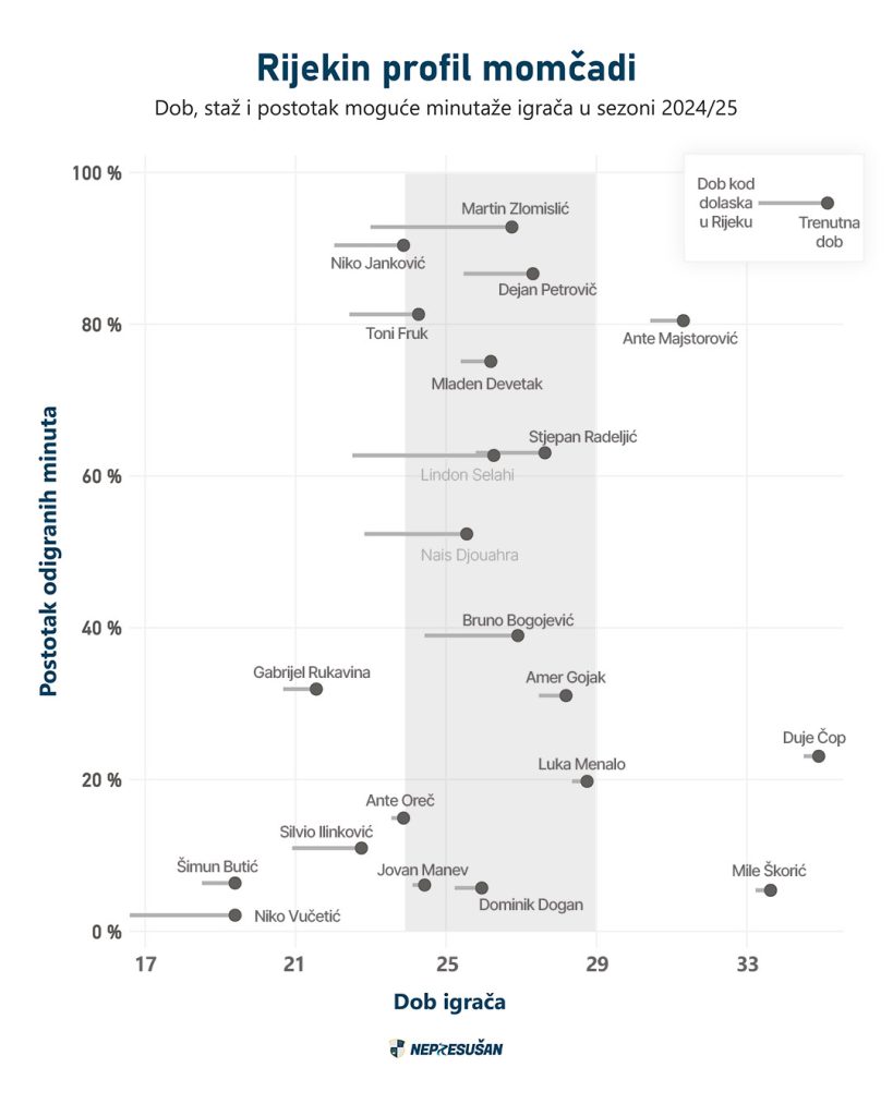 Od deset igrača s najvećom minutažom, dvojici ističe ugovor (Selahi, Djouahra), trojica su pred izglednim transferom (Janković, Fruk, Radeljić), a još trojica ulaze u posljednju godinu ugovora (Zlomislić, Petrovič, Bogojević). Duljina crte na grafici predstavlja igračev staž u Rijeci, pa je i iz njega moguće iščitati da je i deseti igrač po minutaži, Bruno Bogojević, možda napusti Rujevicu ovog ljeta nakon što je standardan bio tek dok se čekao oporavak Ante Oreča. Ako gledamo samo minutažom istaknutije, siguran bi trebao biti tek bivši Istrin defenzivni dvojac, Devetak-Majstorović.