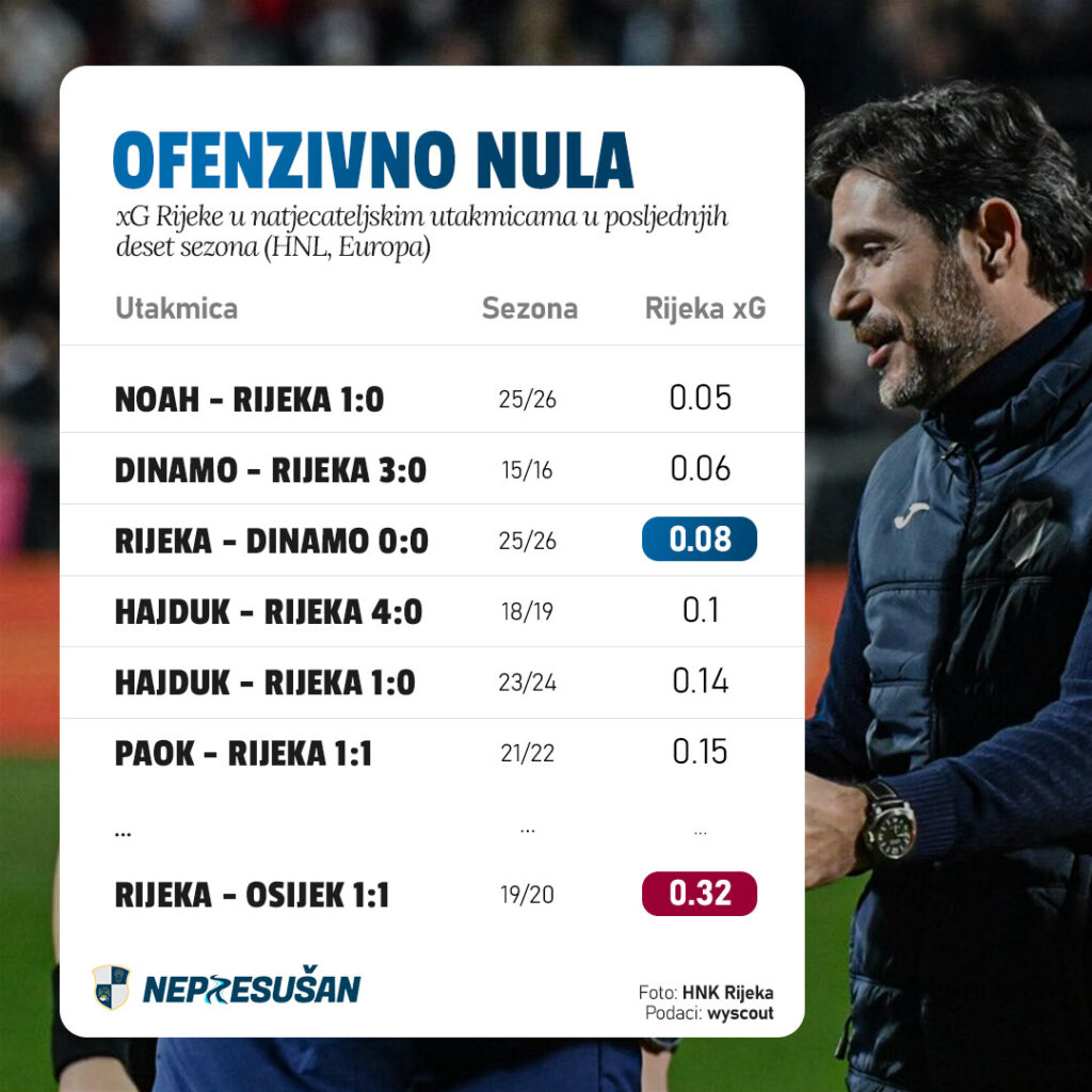Šlag na tortu je derbi s Dinamom. Rijeka je u 94 minute igre na domaćem terenu prema golu gostiju zapucala dvaput. Bez udarca u okvir. Model očekivanih golova to pretvara u xG od 0.08, što je ujedno najslabija ofenzivna predstava Bijelih na domaćem terenu u novijoj povijesti!